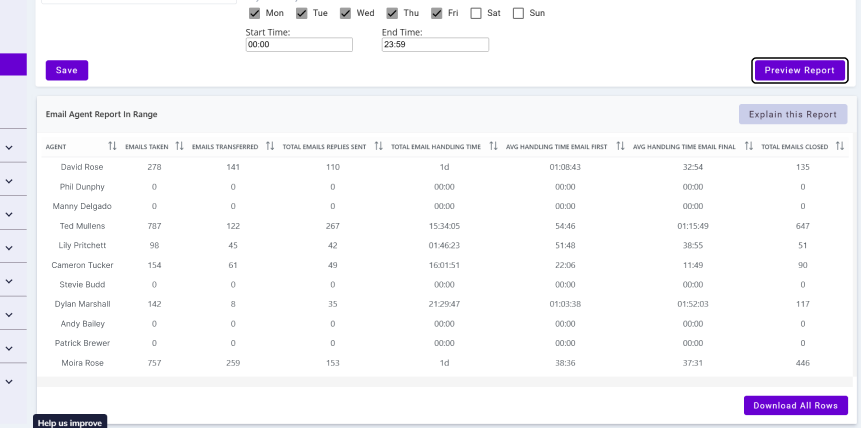 To check the information that is being included in a report you can use the report preview feature. This will generate a preview of the selected report showing up to 500 rows of data.